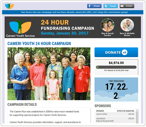 A Matching Campaign is a based on the idea of having one or more matching donors so that for every dollar donated, the organization receives double, triple or quadruple towards a specific cause during a short period of time (24-48 hours). This type of campaign creates a sense of urgency and excitement due to its time sensitive nature.